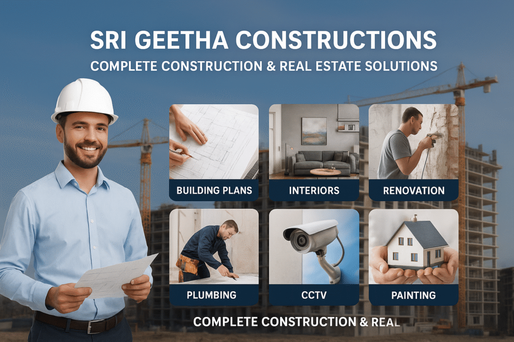 At Sri Geetha Constructions, we provide end-to-end construction solutions — from planning and supervision to interiors, renovations, electrical, plumbing, CCTV installation, painting, and real estate services. With our skilled team, high-quality materials, timely execution, and transparent pricing, we deliver projects that reflect superior quality, precision, and your personal vision.
